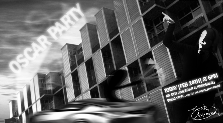 This first one is an invitation to my Oscar Party. The photography is original, except for the car. I played a bit with the concept of the 21st Century Fox type of Hollywood lighting. I guess a good way of saying “movies” without actually showing the Hollywood sign.