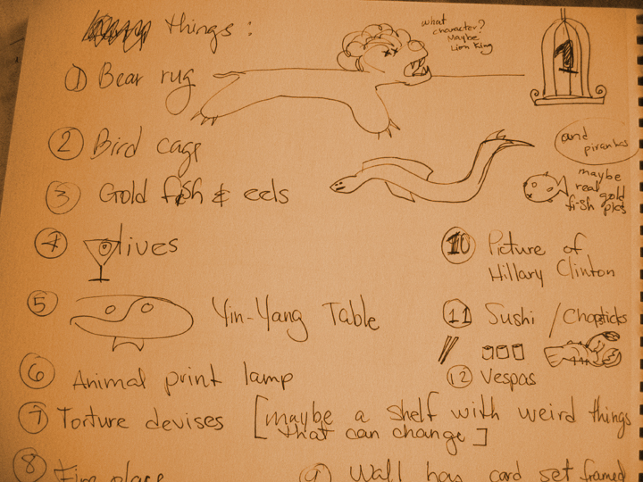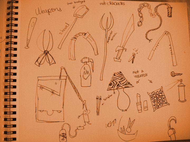 This second one was an exploration of the different weapons that can be used in the show. I’m quite into the ones that are not real weapons… specially the ones that make reference to all things castrating. Like the nutcrackers. Other interesting objects are chopsticks, that could be used as secret microphones.