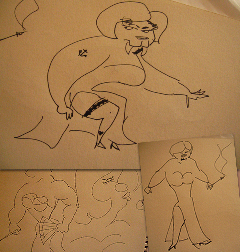 Here are some sketches in which I attempt to stylize what originally was too much of a complex body. Meaning, he had too many muscles (lines and details), and not enough “style.” The challenge for this character has been to show how buff he is, yet show this my throwing simple lines. Also, how do you show a character is a man in drag, when everyday men are fooled by drag queens who have real-life Adam’s apples. It just seems like I need to make it obvious, but not overly obvious. I’m quite happy where things are going with Jr… specially with the upper left style in drawing 2.