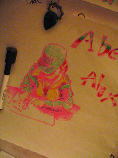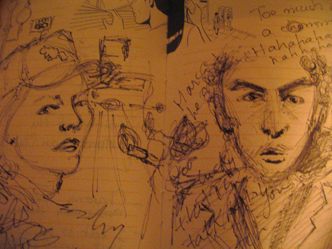 Now, this is my favorite favorite. Also made by Cat. This time on actual paper, and idealizing me slightly… she simply nailed my profile. I just love how notebooks have that quality that unifies everything you do by the penetration of ink through different pages. It is a drawing decorated by past and future journal entries. In a world where all of our experiences come through us without a context (a never-ending present tense), ink splattered reminds us where whe’ve been, and what came after.