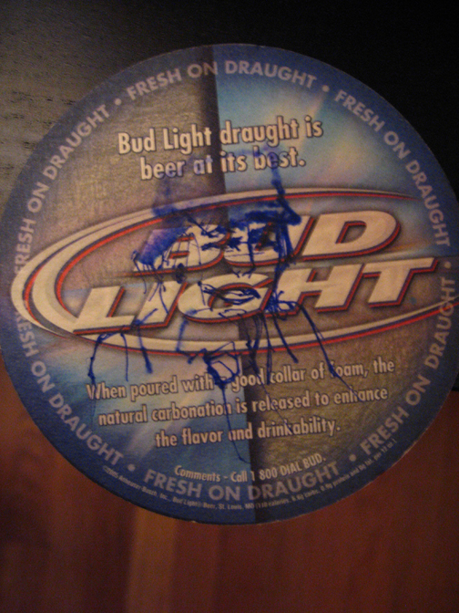 The third session is done on one of my favorite souveniers.. coasters. This one comes from San Diego. Sitting at a bar, my friend and collaborator Cat drew me on one side, and I drew her on the other side. The drawings turned out disastrous (because it was a bad idea to use a wet coaster)… but the idea remained a pretty cool one. Looking back at it, maybe it is two sides of the same “coastered” coin?