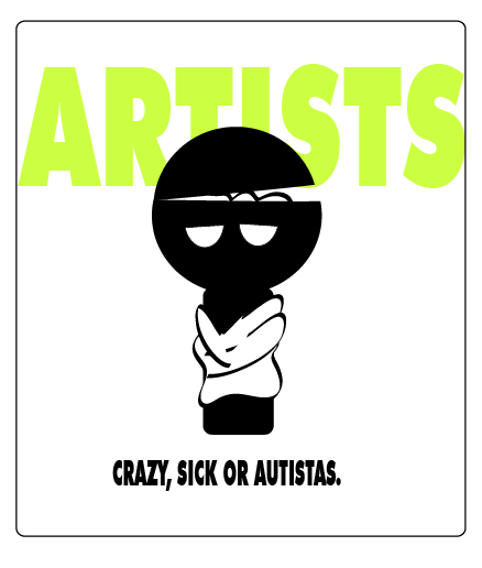 This guy is the first one I did. The first thing I think about artists is mashed brains… so, there you go. I didn’t mention before the little detail with the restrain jacket, a pretty neat lait motif! The font I used was Futura bold… and quite altered I must say.